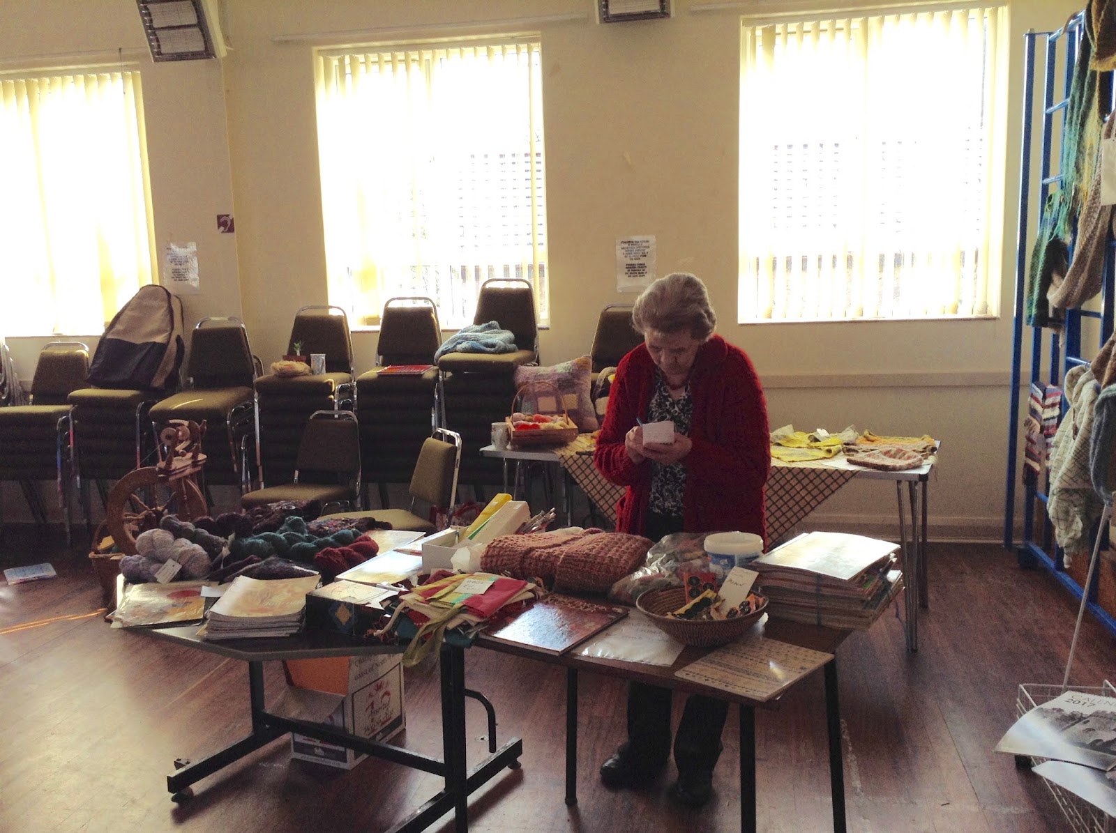 Bryn and Jenni arrived at the crack of dawn to set up the display of work, and Bryn very nobly put on show the files and folders from her recent Certificate of Achievement in spinning. Congratulations to her for her excellent work and well-deserved result.
